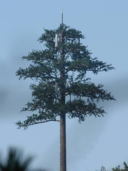 仿生樹,又叫仿生塔、仿生通訊塔,屬于通信發(fā)射塔技術(shù)領(lǐng)域。是讓通信鐵塔與周圍的自然環(huán)境相協(xié)調(diào),有效地解決了風(fēng)景區(qū)等地建站難的問題,其優(yōu)點(diǎn)是保持了原有單管塔的所有優(yōu)點(diǎn),在其外形上作了重大的突破、改進(jìn),以自然生長的松樹,樟樹等為仿真的造型樣本,設(shè)計(jì)素描圖和電腦效果圖,制訂雕塑和噴涂工藝程序,對單管塔仿真?zhèn)窝b,使人們察覺不到塔的存在,把它融入了周圍的自然環(huán)境中。